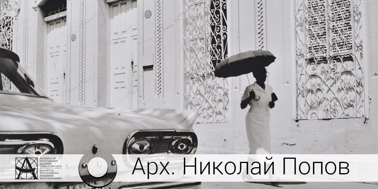 Арх. Николай Попов е един от първомайсторите на българската художествена фотография, ярък и самобитен талант, един от класиците на българското фотоизкуство. Завършва архитектура в Загреб. През 1951 г. е един от първите, удостоени със званието „фотограф художник”, а през 1961 г. за показано високо майсторство и съвършена техника е удостоен със званието ЕФИАП – Отличник на Международната федерация за фотоизкуство. В продължение на две десетилетия той се изявява като фотограф художник с голям обща и изобразителна култура, ярка творческа индивидуалност, с личен почерк и стил. Творчеството му, един неповторим образен свят, е ценно не само като художествено наследство от един отминал етап в развитието на българската фотография, но и защото в него откриваме творби с трайна, непреходна стойност, като реализация на принципи, възгледи и идеи, които предстои да доразвием и обогатим. Основавайки се на принципите на един „одухотворен” реализъм, арх. Попов пресъздава действителността чрез естетическа филтрация, която не идеализира и не разкрасява, а запазва първичната хубост, придава съкровената същност, но и очиства от делничната повехналост, от случайното, несъщeственото, нетипичното, баналното. Той ни показва неща, които всеки гледа, но не всеки вижда!