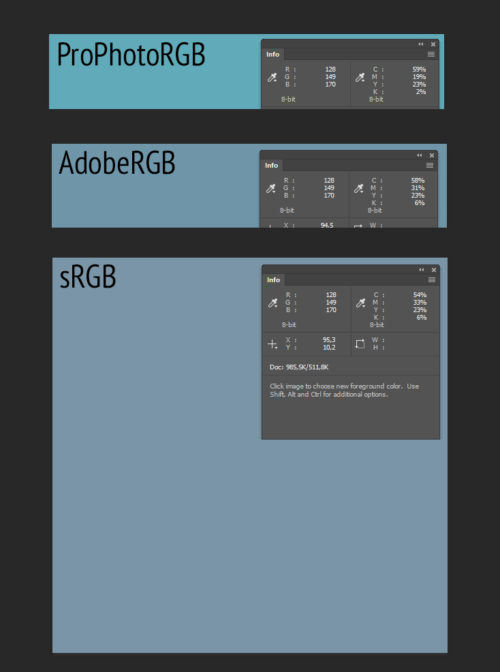 В общи линии, ако трябва да запазите файл за интернет, можете да го запазите и чрез Експорт – Save for Web, където независимо в какво разширение запазвате файла, той е в пространство sRGB, но се скриват и метаданните на документа.