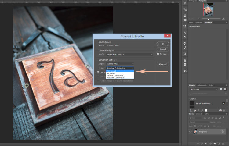 - Saturation – От името трябва да стане ясно, че този алгоритъм се опитва да запази и предаде точно наситените цветове и е удачен за употреба, когато искате да преобразувате в по-голямо цветово пространство. Приложим е и дава добри резултати при различни графики и други изображения, стига да НЕ СА фотографски, тъй като не успява да запази реализма на цветовете и нюансите.