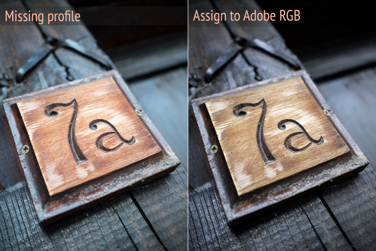За съжаление в случаите на липсващ цветови профил е малко въпрос на импровизация и налучкване какъв профил да присъедините, особено ако ще работите с чуждо изображение, и този който ви го е пратил не ви е казал как е обработвал снимката. Нямате изходни данни, не знаете на какво да стъпите и правите предположение. В повечето случаи изборът е sRGB, с оглед на това че се поддържа от всички монитори и не малка част от снимащите са оставили това пространство и в камерата си. Все пак винаги пробвайте и още няколко профила.Причината е, че и този метод не работи всеки път. Колкото и да е странно, при снимки обработвани в някое от AdobeRGB или sRGB (макар и неприкачен при запазване) възстановяване на някой от тези профили чрез Assing при отваряне работи. Ако обаче човек не е наясно какво работно пространство е настроил и без да знае е обработвал в ProPhoto RGB, след което е съхранил файла без да прикачи профила – в този случай Ps не успява да прикачи коректно профил, освен отново ProPhoto RGB. Пробвано при различни експерименти. Лошото е, че когато файлът не е ваш, не може да си позволите експерименти.