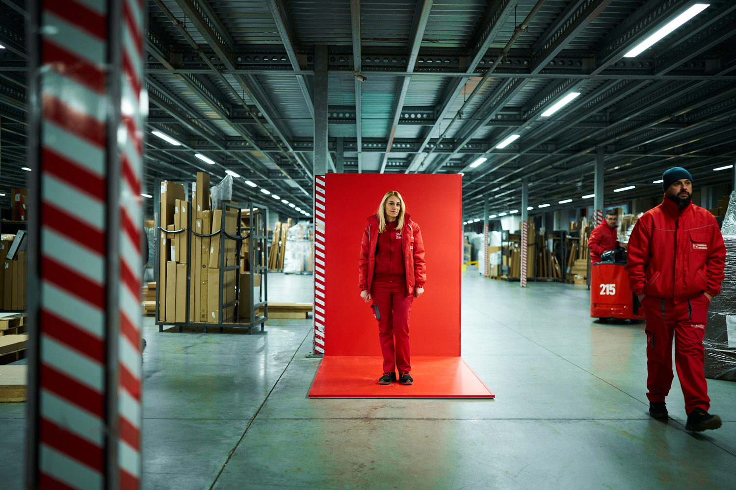 Най-класически тип портрет е когато човекът застава на определено място, позира статично в очакване да го снимат. Ние наподобихме тази ситуация, като използвахме предварително създаден твърд фон, който местихме от локация на локация. Но разлика от кадрите от началото на миналия век е, че този фон беше частичен, не покриваше целия кадър, за да може да си види реалната локация на която сме. Отделно така този фон отделя обекта от мястото, но не напълно. Разбира се, цветът на този декор беше фирменото червено.