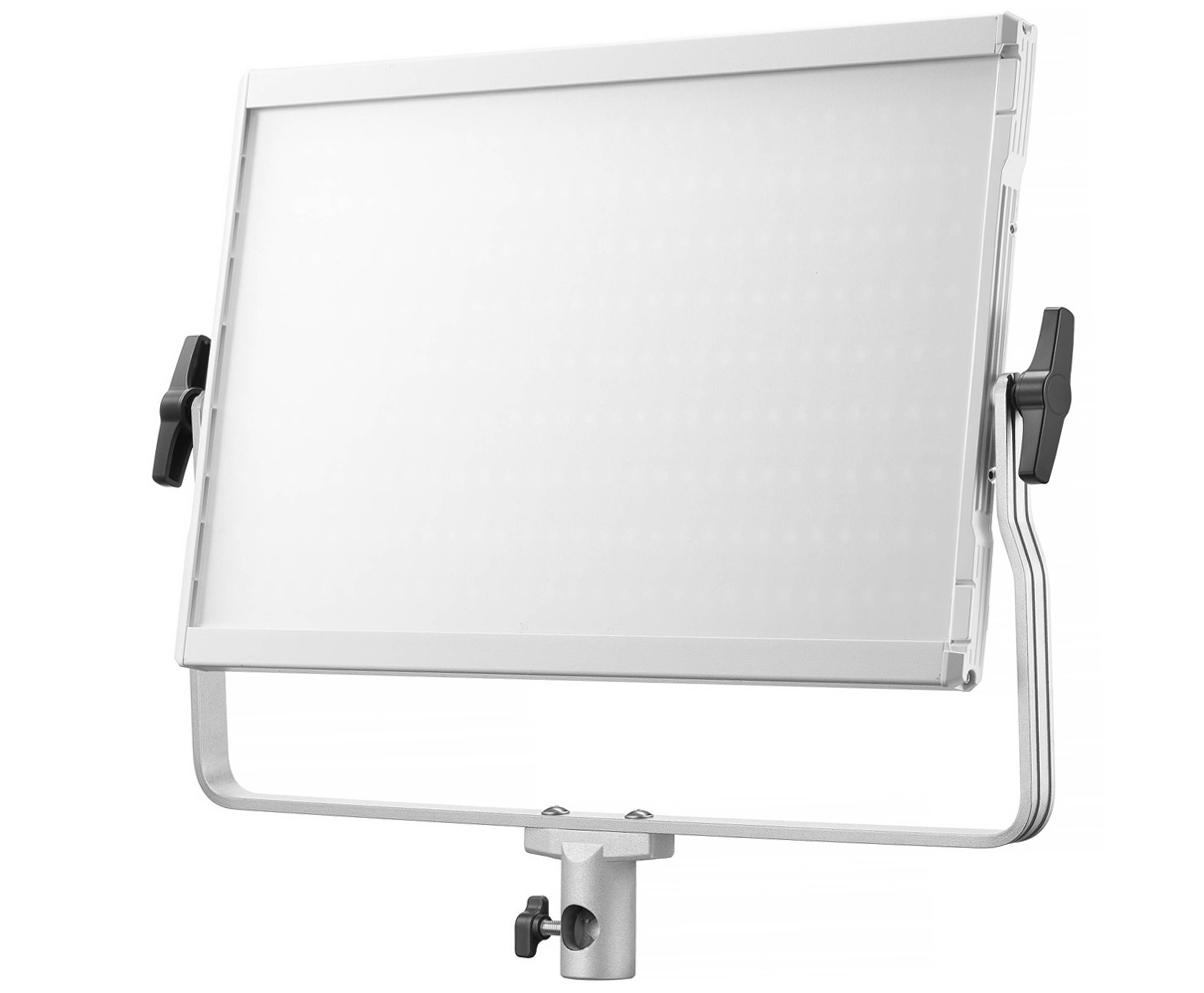 Litemons LP1200R RGB както може да видите от галерията също е комбинация от бяло със сребриста лира, благодарение на която панелът се закача на статив и накланя нагоре-надолу.