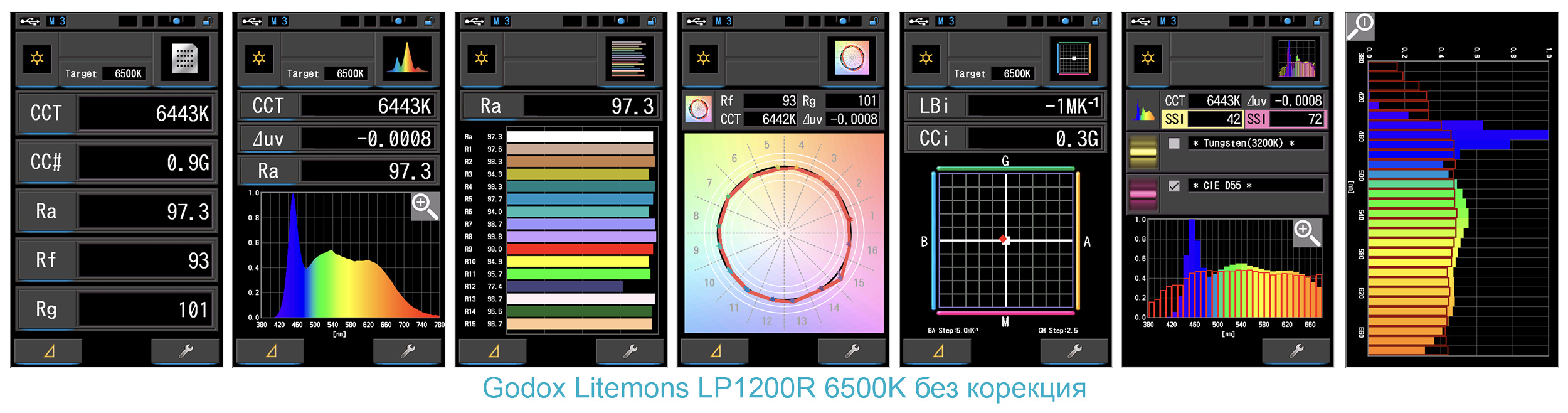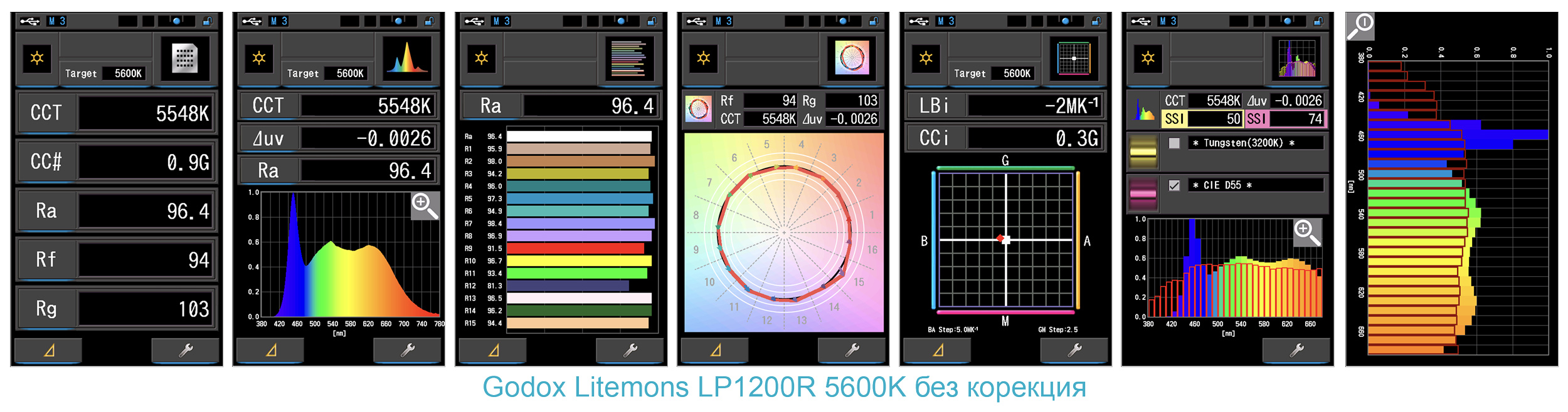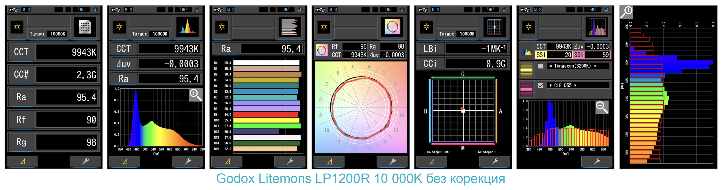 Както често явление напоследък от Godox, но цифрата в името на Litemons LP1200R RGB не отговаря на мощността, която реално е. имаме 120 ватов панел и ето какви са неговите характеристики на метър от него при няколко различни цветни температури: