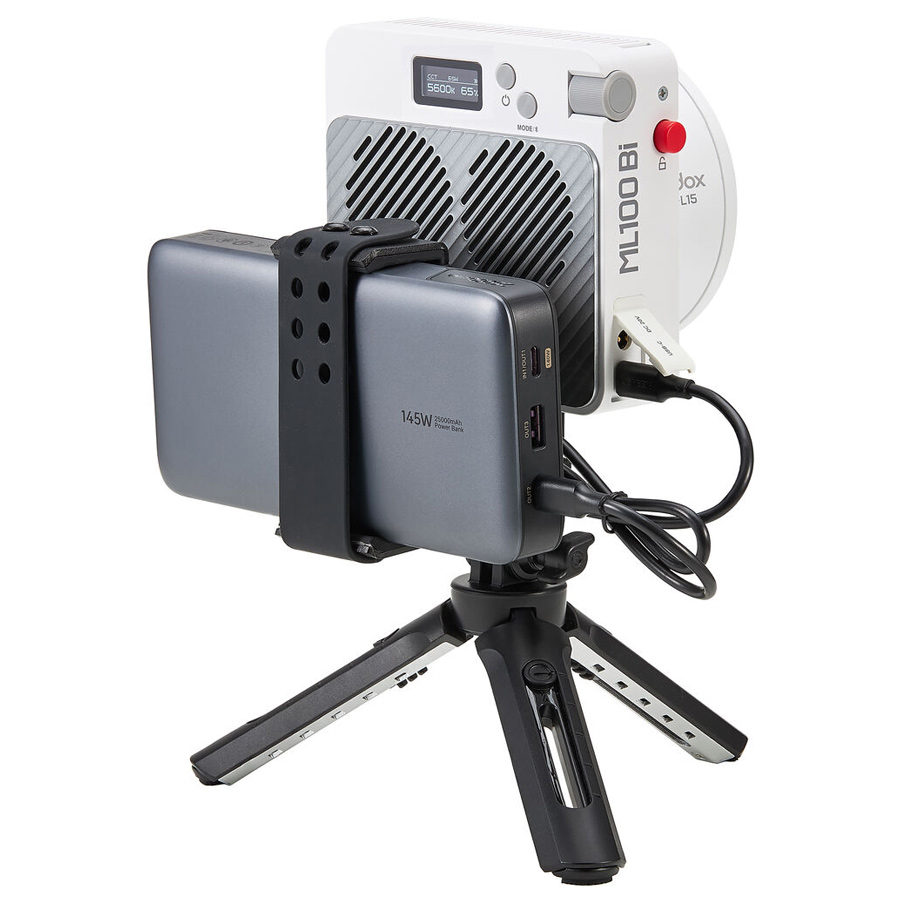 Godox ML100Bi по презумпция не е правено за студийно осветление. Както споменах неговото приложение е по-често да бъде носено и управлявано от асистент или чирак крадящ занаята. Затова се предлага освен самостоятелно но и в два комплекта в зависимост каква външна батерия ще използвате. При мен бе комплектът с мини статив и държач за среден клас външна батерия или Power bank, както се е наложило. Другия комплект и предназначен за употреба с V-Lock тип батерия. Двата комплекта има и един допълнителен рефлектор ML-L36 в случая, защото Godox ML100Bi по подразбиране идва с ML-L15.
