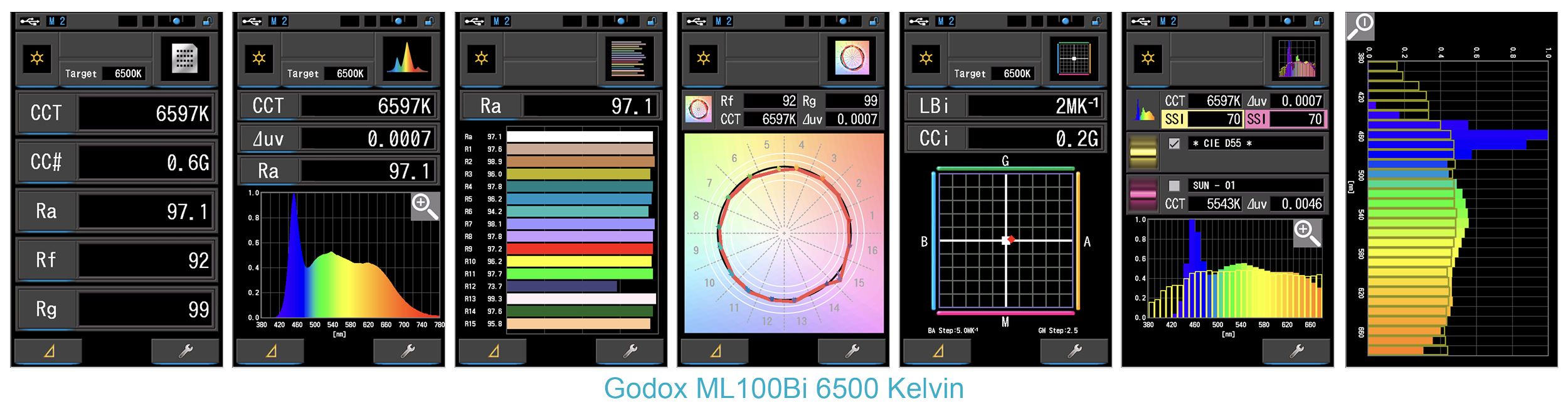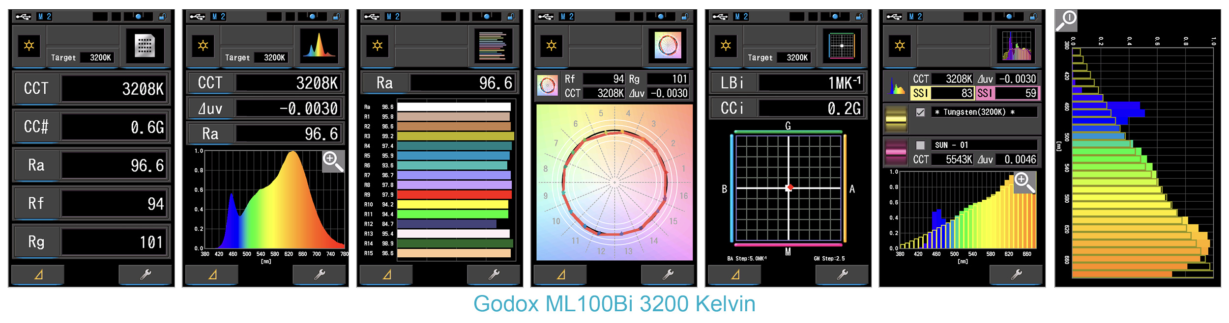 Средният CRI е почти 97, което е много добър показател. Godox ML100Bi работи много добре на две от основните цветни температури: 3200 и 5600К. За снимащите видео бих препоръчал да използват 3200К, когато е възможно защото там SSI индекса по-висок отколкото при 5600К. Всъщност бих казал традиционно вече 3200К си остава една от най-добрите температури за работа, както за видео, така и за фото с оглед, колко е по-пълен спектъра и индексите са по-високи.