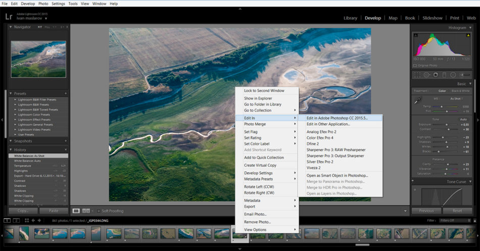 От тук нататък идва специфичната обработка на снимката, която зависи от личното ви виждане на автор. Но дори да сте започнали да обработвате в Lightroom с голям набор кадри, то един десен клик върху дадена снимка ви дава възможност да отворите снимката във Photoshop (без да зареждате Camera RAW) с вече направените корекции и да я довършите, ако искате. Като при зареждане на снимката във Photoshop, ако сте си включили тази опция, програмата ви показва цветното пространство на импортирания файл и ви пита дали искате да го смените и с какво. Съветвам ви да си включите тази опция, особено ако се занимавате с печат. Комуникацията между двете програми е бърза и удобна, тъй като все пак са разработени от една и съща компания.