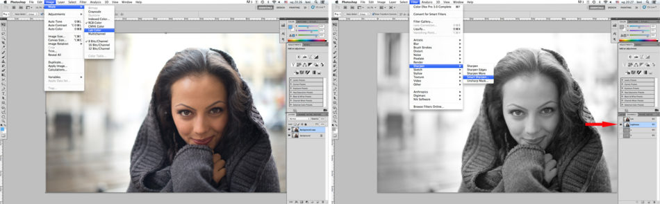 – Променете режима на дублирания слой Image – Mode – Lab Color.
