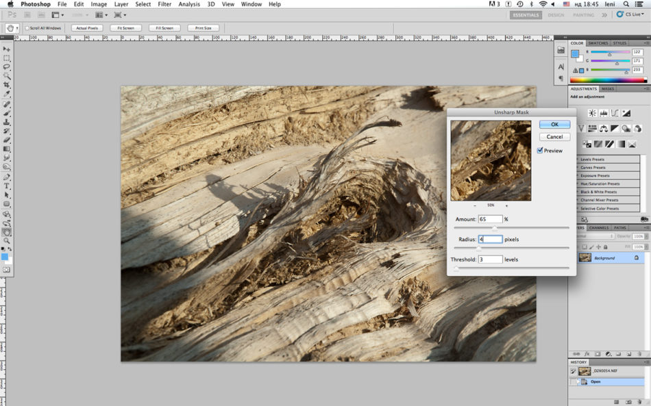 Amount: 65%, Radius 4, Treshold 3.