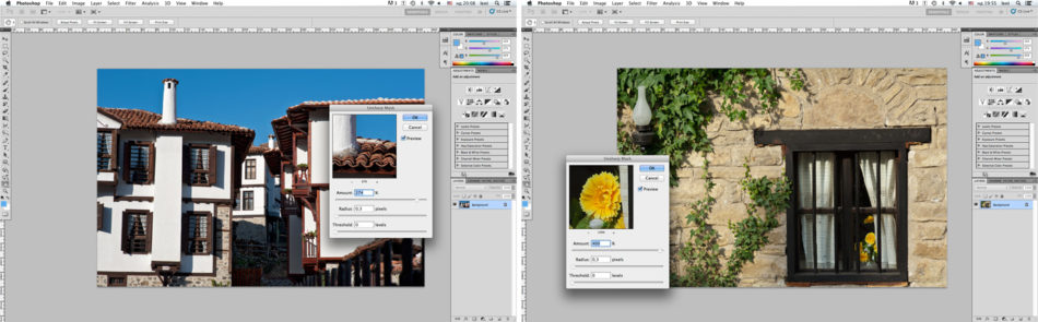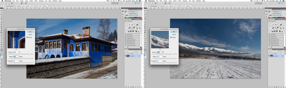 4. Ако се нуждаете от Умерено изостряне – т.е. искате само леко да подчертаете общата картина, например на сгради, пейзажи, интериор, или продуктова фотография, заложете на следните стойности: Amount: 225%, Radius 0,5, Treshold 0.